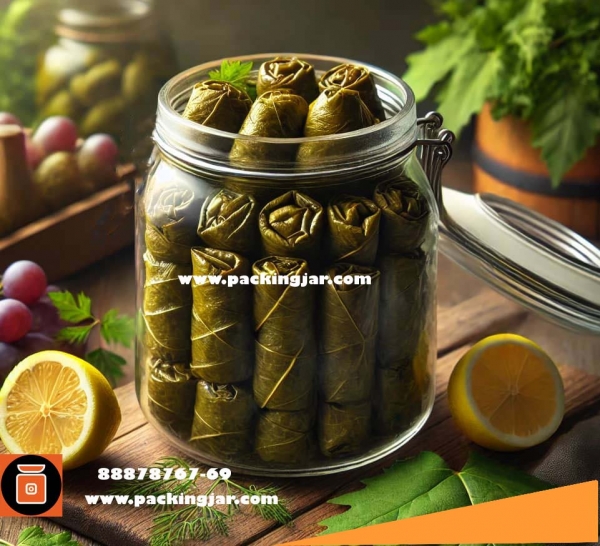 چند عدد برگ انگور را روی هم قرار داده و باریک لول کنید و بطور عمودی داخل داخل شیشه بگذادید و درب شیشه را ببندید